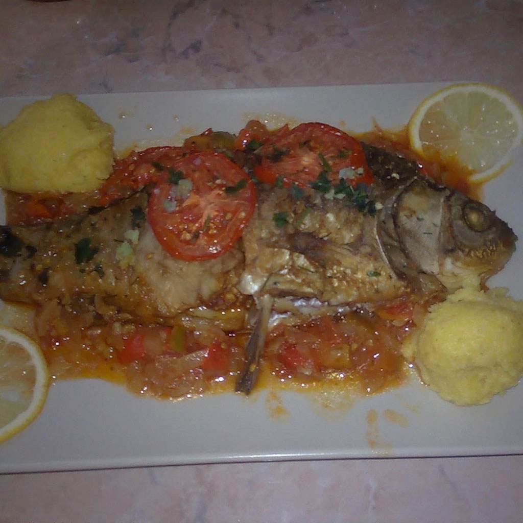 Se va adauga sucul de rosii, vinul alb, zeama de lamaie, sare, usturoiul maruntit, foaia d dafin si pestele si apoi se baga la cuptor timp de 30 de minute.
